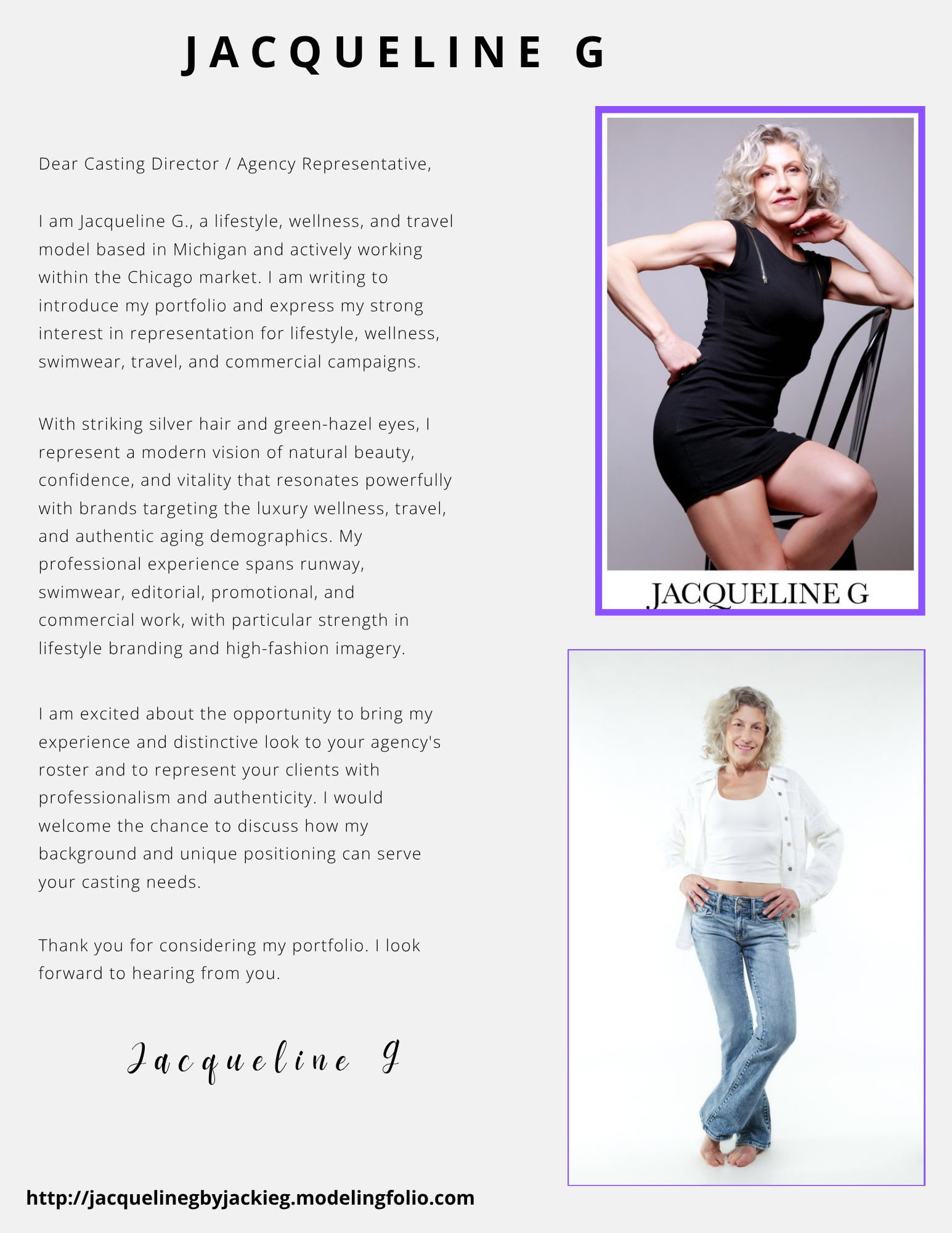 I’m Jacqueline G., a silver-haired, green-eyed model representing a modern vision of natural beauty, confidence, and vitality. Based in Michigan and working within the Chicago market, I specialize in luxury lifestyle, wellness, travel, and editorial campaigns that celebrate strength, grace, and authentic living at every stage of life.